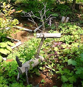 中村家の敷地は約1200坪あるのだが、平坦地がやや足りない。そこで、林業事務所に申請し、南接した国有林の一部を借りることができた。面積は約100坪だが、檜を伐採したところに花木を植える予定。その中心に野外炉を据えたのである。もっとも、石を最初に利用したのは、野外炉ではなく池だった。中村家には10匹くらいの川魚を飼える池があるのだが、流入した砂が底に溜まりやすく、大雨のときオーバーフローで魚が逃げてしまう。さらに、トンビや猫にも盗られた。その防止策として、池の縁に石をおいたのだ。 |