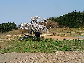 日本三大桜である三春の「滝桜」は花がかなり落ちて見頃を過ぎてしまいましたが、船引町の「小沢の桜」は18日でも美しい風景を保ち、多くの花見客で賑わいました。樹齢は100年弱。この桜はタバコ畑のなかに1本だけあり、樹下には祠、遠くには移ヶ岳とたいへん風情があります。そのため2000年公開の映画「はつ恋」(田中麗奈主演)のラストシーンに使われ、有名になりました。小さな桜ですが、隠れた観光名所です。 |